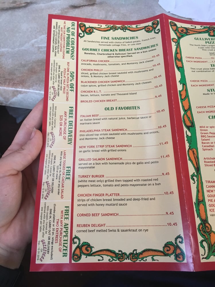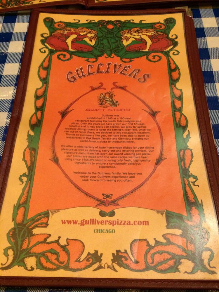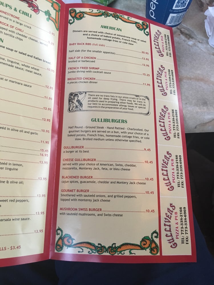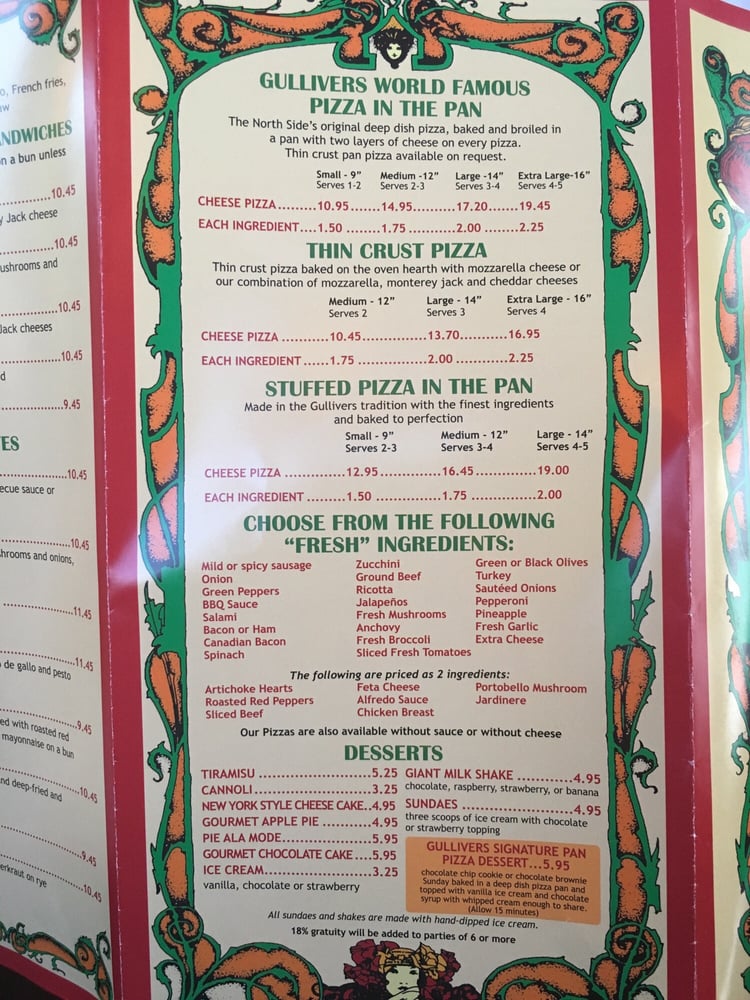 Introducing the menu at Gullivers Pizza, a legendary Chicago pizza spot known for its iconic deep-dish pies and eclectic ambiance. Located at 2727 W Howard St, Gullivers offers a full bar, outdoor seating, and a unique atmosphere filled with antiques. Customers rave about the thick cheese, amazing crust, and premium pizza experience. The menu features a variety of options beyond pizza, including sandwiches, salads, and soups, all served with impeccable quality and friendly service. Don't miss out on their half-price thin crust pizza specials on Fridays after 9 pm. Whether you're a pizza aficionado or looking for a memorable dining experience, Gullivers Pizza is a must-visit destination in Chicago.